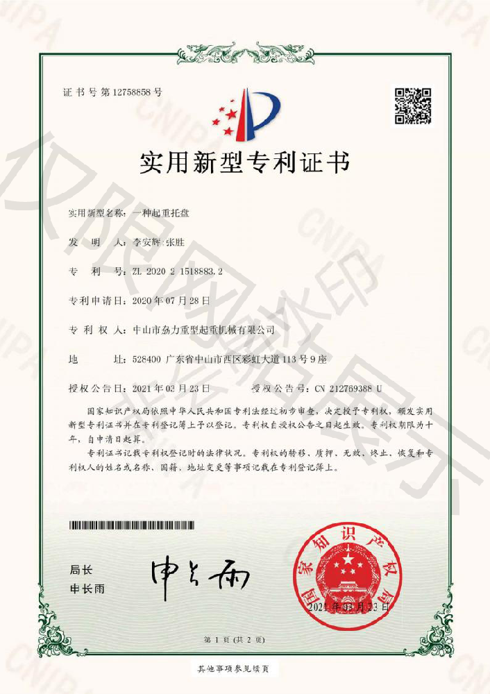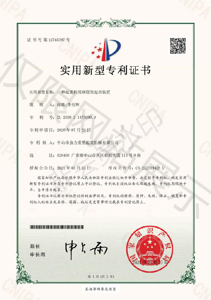 實(shí)用新型專利證書 -- 起重機(jī)用鋼筋籠起吊裝置