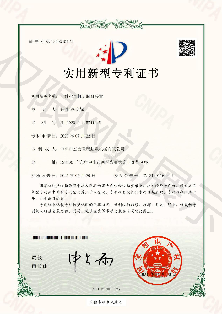 實(shí)用新型專利證書 -- 起重機(jī)防脫軌裝置