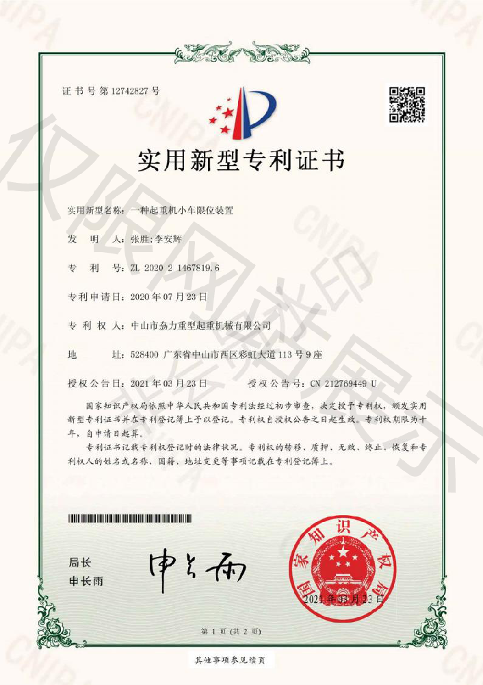 實(shí)用新型專利證書 -- 起重機(jī)小車限位裝置