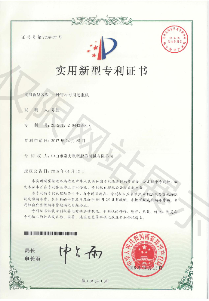 實(shí)用新型專利證書 -- 管材專用起重機(jī)