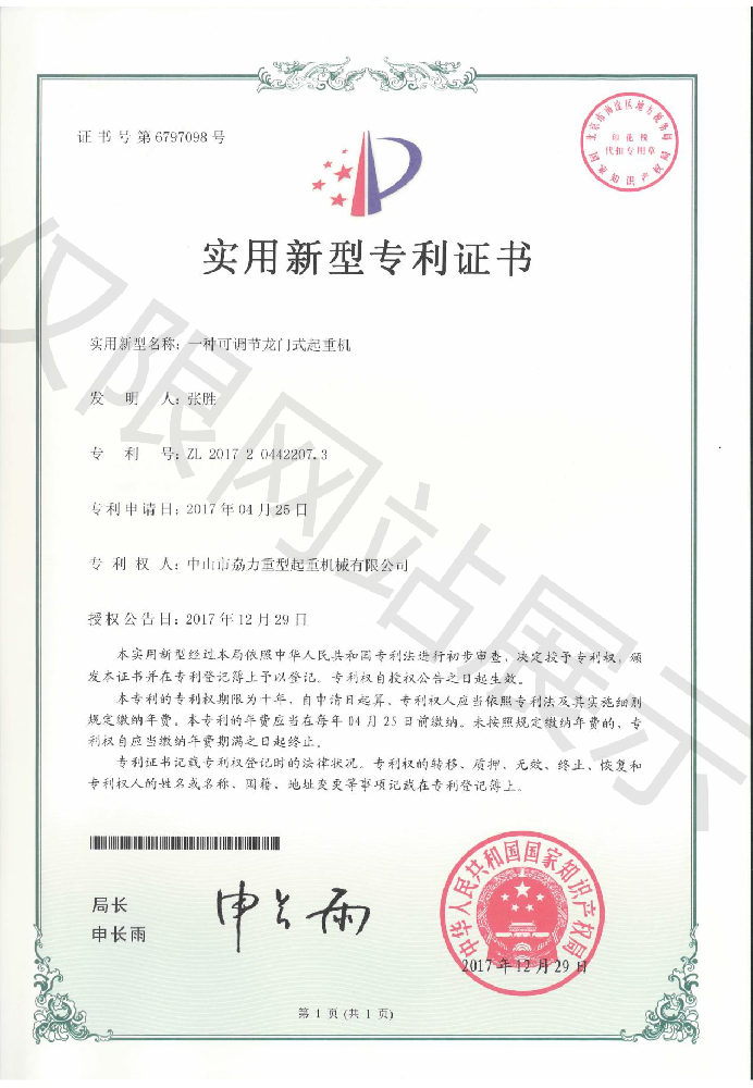 實(shí)用新型專利證書 -- 可調(diào)節(jié)龍門式起重機(jī)