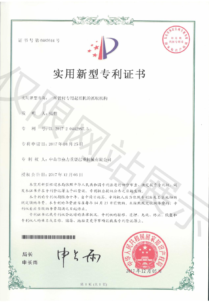 實(shí)用新型專利證書 -- 管材專用起重機(jī)的抓取機(jī)構(gòu)