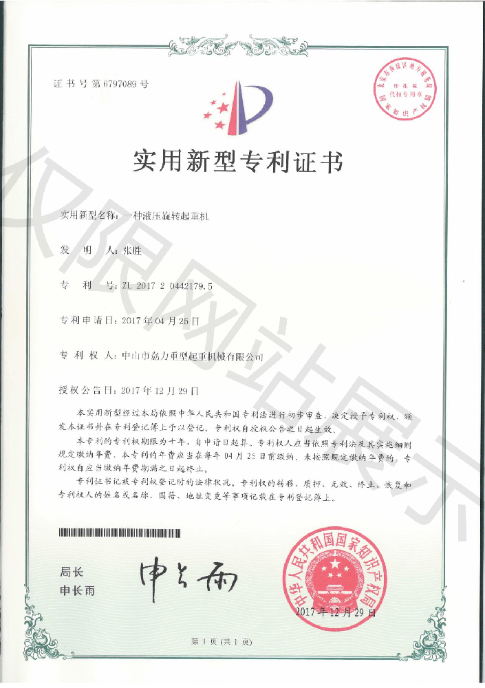 實(shí)用新型專利證書 -- 液壓旋轉(zhuǎn)起重機(jī)